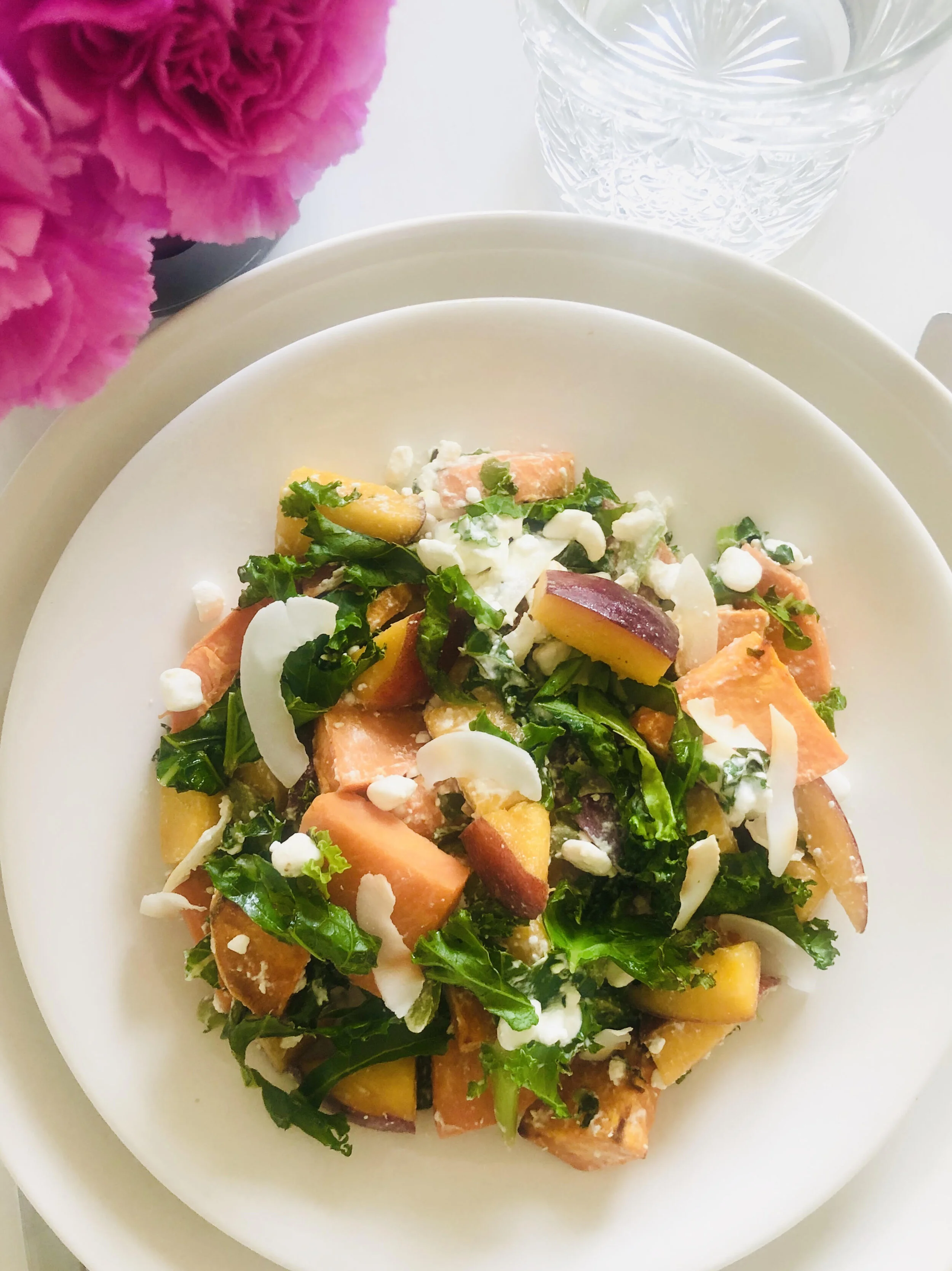 When the sweet potato is finished, add to the rest of the ingredients in the bowl. Keep the parchment paper on the baking tray and place the kale there, drizzle with the olive oil. Place in the oven (same heat as sweet potato) for about one minute, until its soft, not burned.